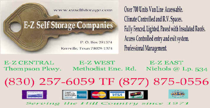 E-Z Self Storage East3120 Nichols Street Kerrville, Texas 78029-1374 Located in the east end of Kerrville at the intersection of Canyon and Nichols street, just off of Loop 534 and State Highway 27, this facility offers daylight access via an access controlled gate. This fully paved, fenced and lighted facility offers easy access to any of our five unit sizes. We have 5 X 10, 10 X 10, 10 X 15, 10 X 20 and 10 X 30's at this location. All of our units offer overhead roll-up doors and each unit is fully insulated and secured with your lock using a four bolt protected lock system. Contact us today for your self service storage needs.
